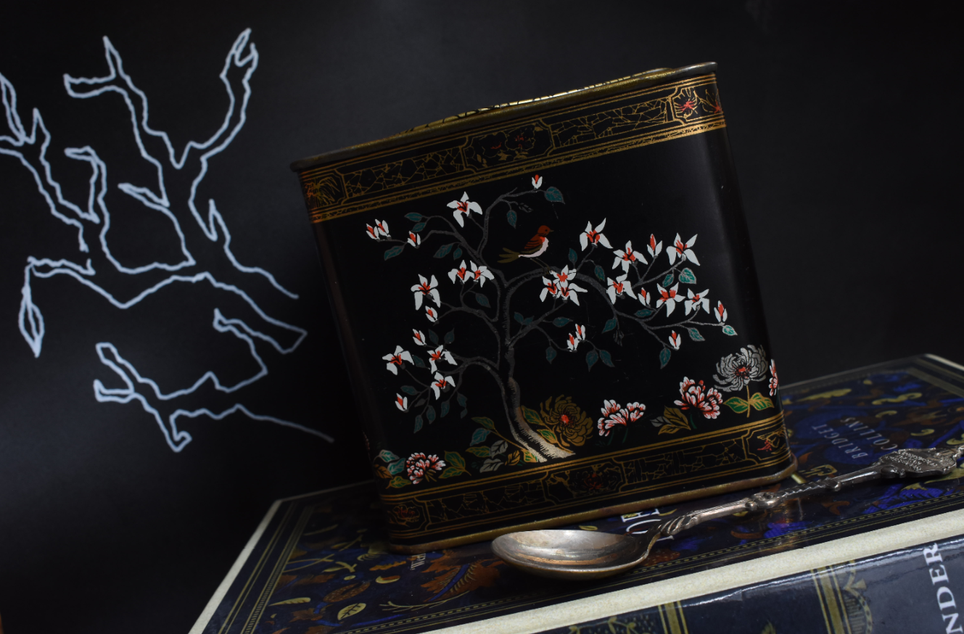 Ik heb dit theeblikje gekozen omdat ik de illustraties erop erg mooi vind. Er zijn veel natuurlijke elementen in terug te vinden die prachtig kleuren op de zwarte achtergrond. Ik besloot dan ook deze elementen verder door te trekken in het decor. Nadat ik witte takken had getekend op een zwartgeverfde achtergrond heb ik gespeeld met een stuk plastic folie voor de cameralens, waarop warm licht reflecteerde afkomstig van kerstlichtjes die ik naast de camera hield. Hierdoor kreeg het geheel een donkere, mysterieuze maar sprookjesachtige sfeer. Ik was verrast door deze ontdekking en heb dit vastgelegd op beeld in een reeks foto's. Ik ben tevreden met de resultaten en ben geïnspireerd om verder te experimenteren met deze mysterieuze abstrahering in de toekomst! Wellicht pas ik deze toe in analoge of digitale collages of andere grafische experimenten.